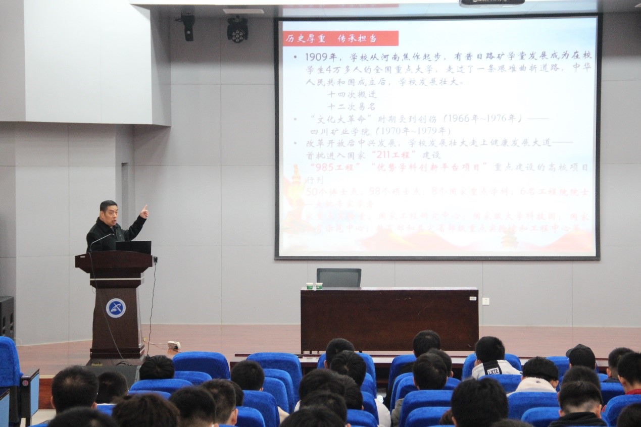 本次讲座的内容分为“赓续历史、传承担当”“荣誉责任、提高素质、努力前行”和“争做新时代有志有为青年”三个部分。首先,周老师介绍了我校的历史沿革,从焦作路矿学堂开始,历经14次搬迁,延续成为今日的百年矿大。周老师还讲述了自己在矿大多年的亲身经历,流露出对矿大的真挚感情。随后,周老师讲述了他曾经作为一名班主任,如何与学生相处的故事。他指出,作为一名矿大人,身为一名大学生、一名学生骨干,应当肩负怎样的责任,拥有怎样的品质。最后,周老师就当代大学生如何做一名新时代的有为青年提出建议,寄语同学们要刻苦努力、敢于实践、敢于拼搏,争做优秀的矿大人。在同学们热烈的掌声中,本次讲座圆满结束。