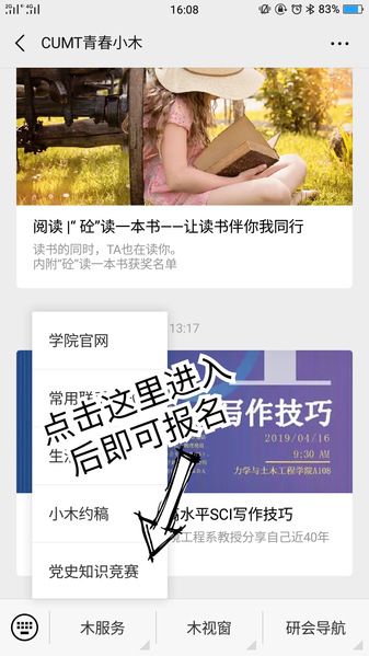 1.微信搜索并关注公众号:“CUMT青春小木”;