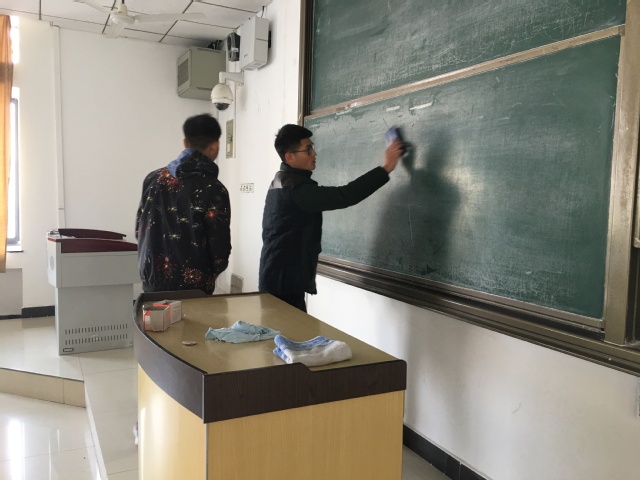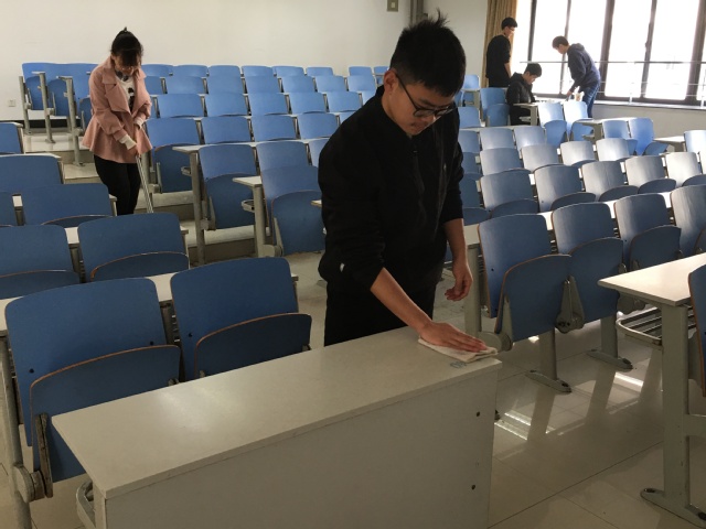 上午九点,志愿者们准时到达博一集合,负责人首先说明活动的目标,并提高大家的工作积极性,接着进行了清扫活动的分组安排,之后大家便投入了紧张的清扫工作中。有的去把座位和桌面遗留的垃圾清理干净,有的拿起抹布对窗户栏杆上的灰尘进行清理,有的将黑板上残留的粉笔灰尘擦拭干净,不放过任何一个微小的死角。当清扫到有同学正在学习的教室时,志愿者们自觉减小打扫时发出的声音。经过志愿者们两个小时的认真打扫,窗户变得明亮,栏杆变得清洁,黑板没有了残留难去的粉笔灰尘,博一教学楼变得整洁一新。志愿活动于上午十一点圆满完成,志愿者们的工作也得到了管理员与环卫阿姨的一致肯定。