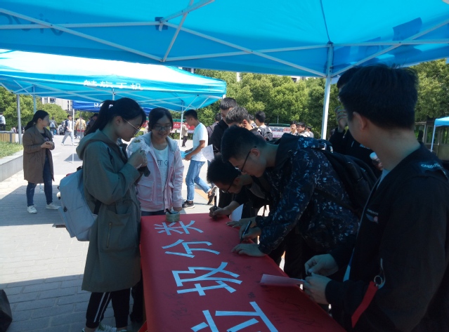 的志愿者们一起进行活动宣传。志愿者们通过向路过同学宣传的形式,耐心的向同学们介绍此次垃圾分类活动。同学们也纷纷参与到宣传活动中来,帮助志愿者们进行宣传,并在活动宣传横幅上签下自己的名字。垃圾是放错地方的资源。然而垃圾的回收与利用却被垃圾分类这一问题所限。当今社会,垃圾回收并非技术问题,而是人们没有较强的垃圾分类回收的意识。本次垃圾分类活动的开展,能有效改善学校的垃圾处理问题,方便同学们的生活。在此次活动中,同学们纷纷表示愿意加入到垃圾分类活动中去,共建美好校园环境。在接受宣传的同时,同学们也提出了自己身边存在的一些垃圾分类不到位问题,给志愿者们开展开展后续活动提供了一些宝贵的建议。