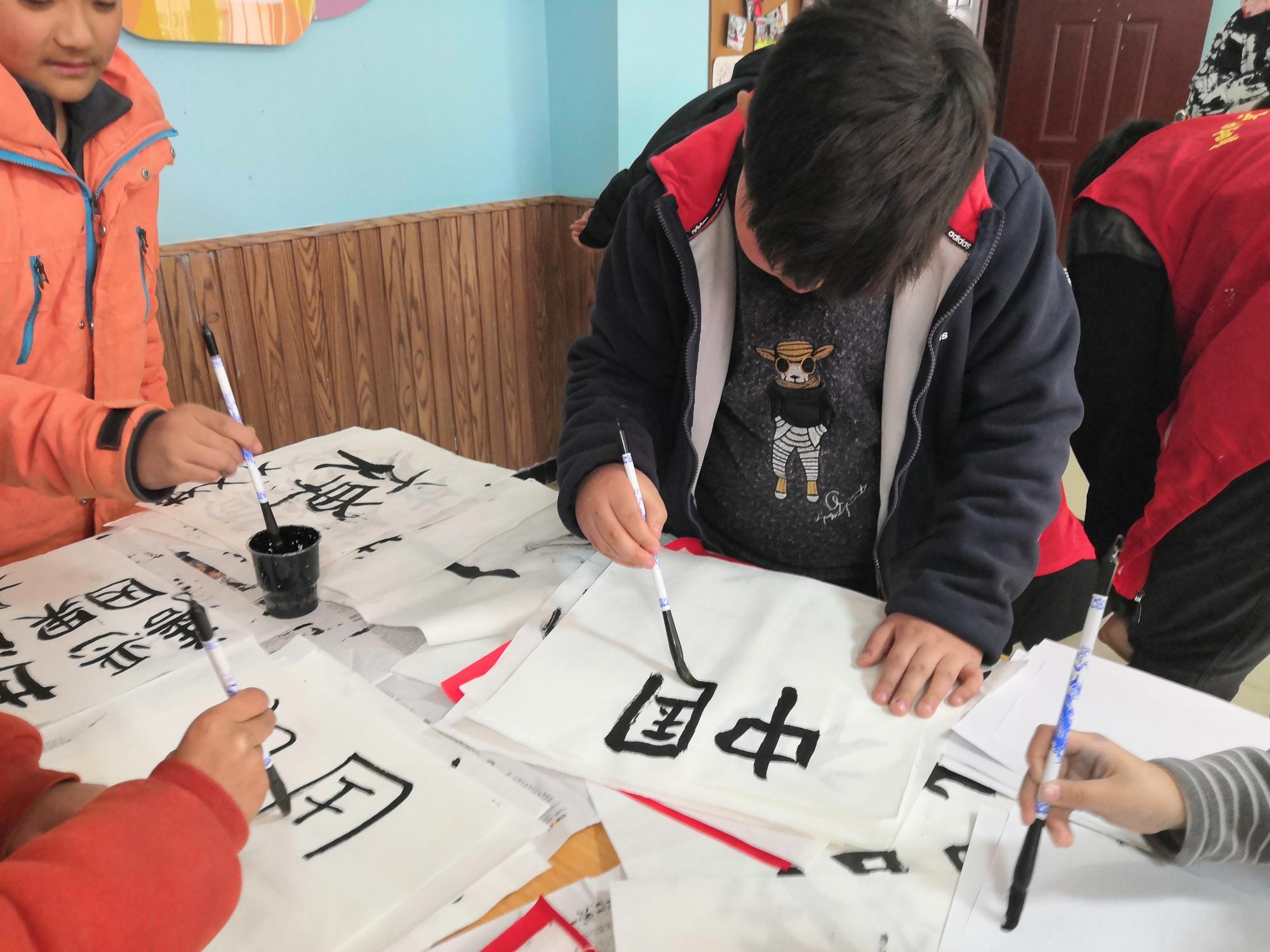 在大李庄村委会,乒乓球协会的志愿者们耐心教授了乒乓球攻球技巧,带领孩子们感受乒乓球的乐趣。前往宗庄村综合服务中心的志愿者们为小朋友们辅导功课、检查作业,在一次次互动中,志愿者与孩子们的关系越来越亲密。彭奕昕同学以PPT授课的方式,为孩子们讲述了书法的相关知识,随后带领孩子们分别进行了软笔书画和绘画的练习。在志愿者的协助下,孩子们很快掌握了毛笔的握笔与书写技巧,尽情创作展示创意。