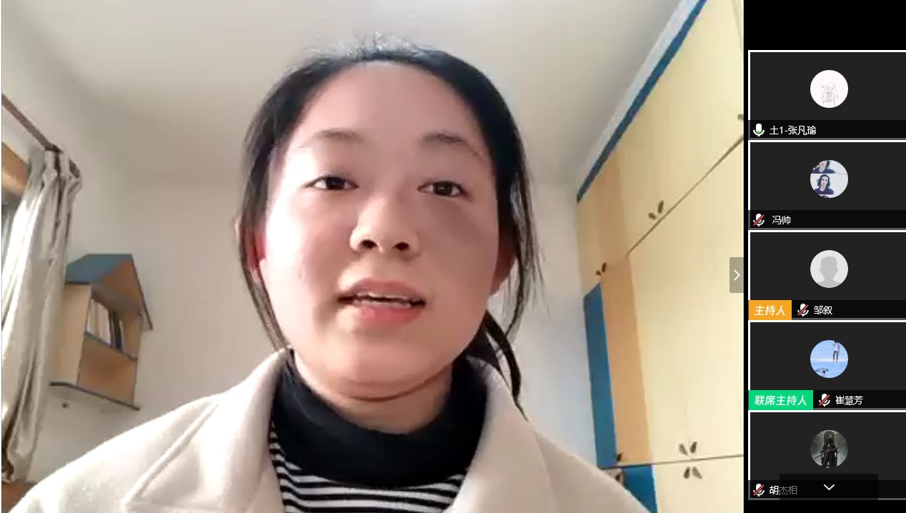 健康打卡任务,保证个人健康安全。演讲时,部分同学围绕疫情阐述自己的看法,也有同学就疫情期间如何上好网课、疫情期间家中小欢喜等主题进行分享。活动的最后,钱烨雷同学通过视频直播的方式,为大家演奏了一段乐曲,得到同学们的一致好评。