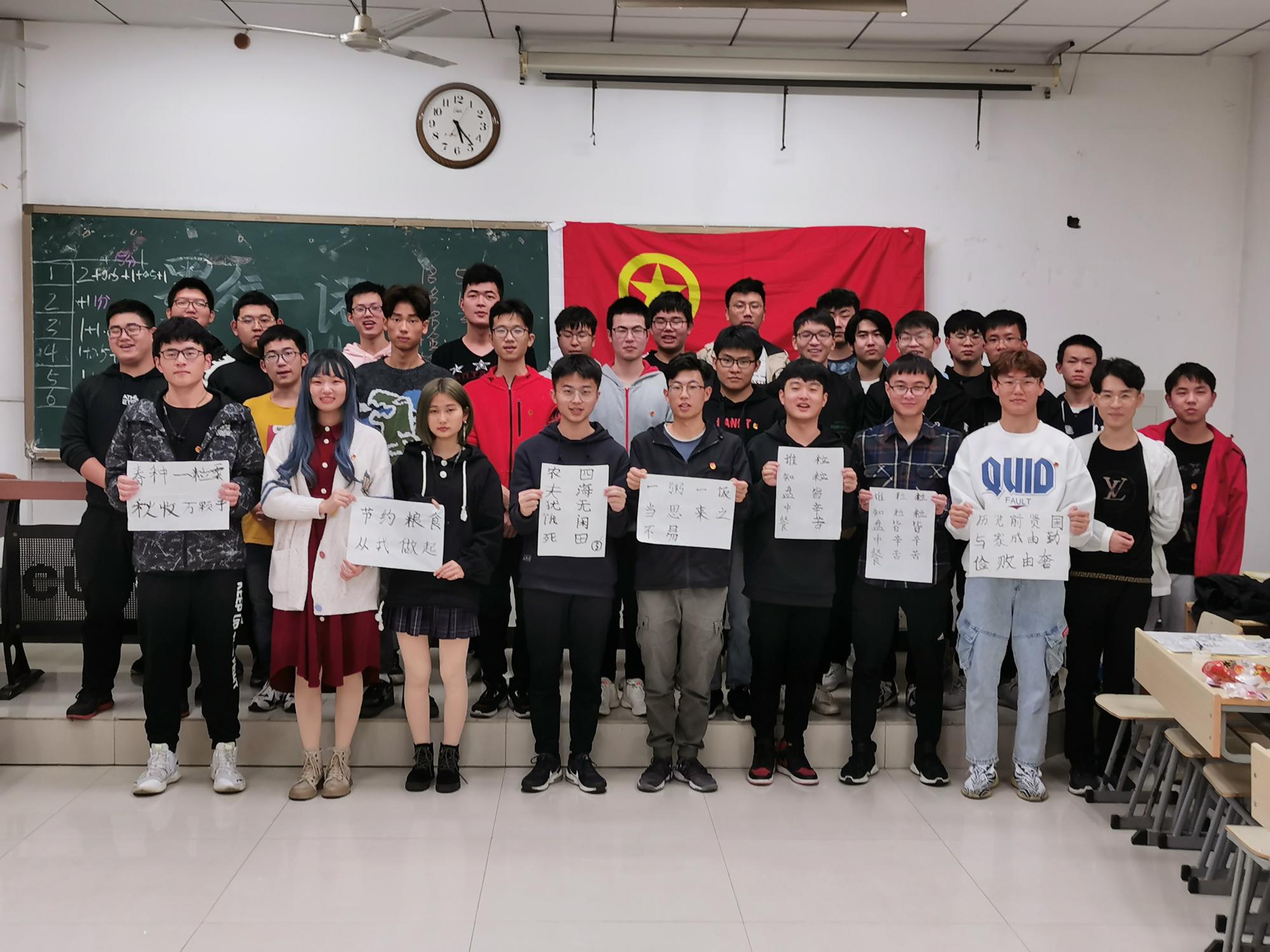 为响应习近平总书记关于“厉行节约”的号召,唤醒和加强同学们的节约意识,拉近班内同学之间的距离,土木工程19级八班于10月18日下午在博学4号楼C106开展“墨行一诺,爱国惜粮”主题团日活动与班级首次团辅活动。
