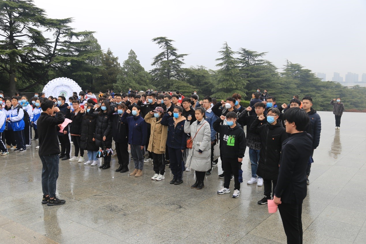 团委副书记张军忠带领同学们重温了入团誓词。活动最后,同学们绕行淮塔一周,瞻仰淮海战役烈士纪念塔。