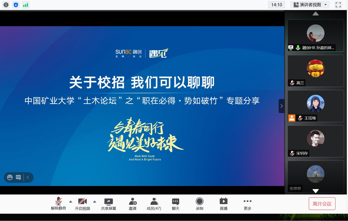 研究生会于4月15日晚线上举办了第二十七期“土木论坛”之“职在必得,势如破竹”就业指导讲座。本次讲座邀请到融创地产HR孙晨女士为同学们答疑解惑,帮助同学们更好地制作简历、迎接面试,顺利拿到心仪的工作。
