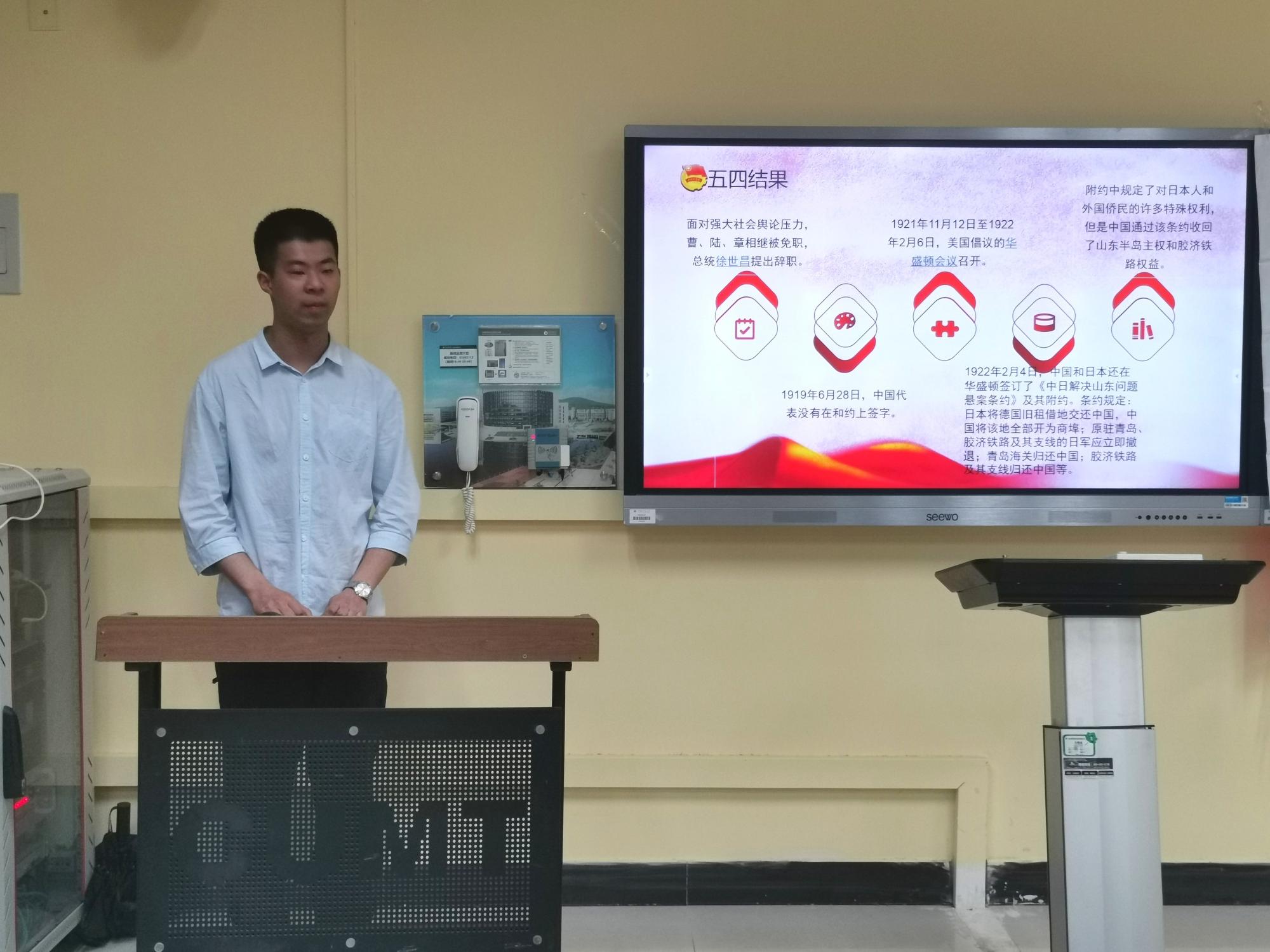 晚上7时,活动正式开始,工管19-1班团支书马小川向大家介绍了五四运动的起因和经过,其经历了北京学生运动、上海工人罢工、文界响应、中国收回主权等阶段。随后,工管19-2班团支书郑琦为大家介绍了五四运动的结果。郑琦同学讲到五四运动中天津的学生代表孙越崎先生,并带领同学们观看了由中国矿业大学拍摄的关于孙越崎先生的介绍影片。观看影片后同学们热血澎湃,为孙越崎先生不惧困难、勇往直前的精神感动。最后,郑琦同学讲解了五四运动的影响。他认为五四运动不仅是中国学生的爱国运动,更是影响了中国思想文化,政治发展方向。五四爱国运动是一次彻底的反对帝国主义和封建主义的爱国运动,起到了青年学生的先锋作用。吾辈青年,更应继承前辈们的优良品德,把五四精神传承下去。