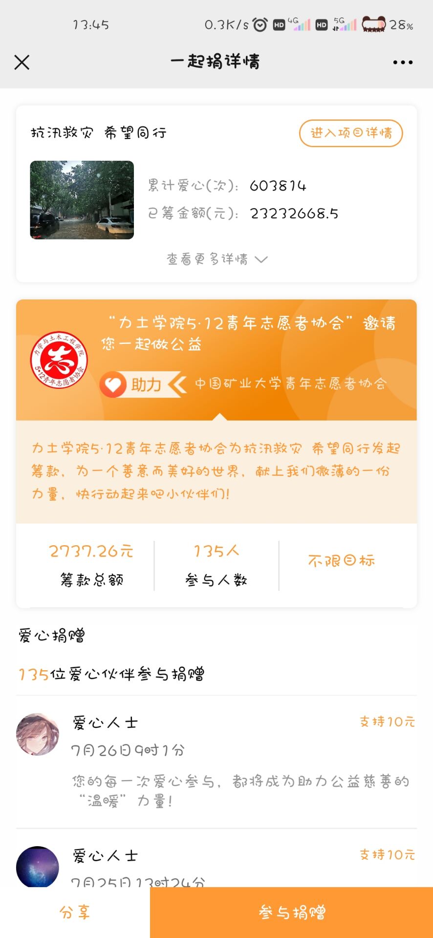 5•12青年志愿者协会积极参与“抗洪救灾,希望同行”募捐活动,在暑期为河南抗洪救灾活动筹集善款2700余元,我校共筹集善款32000余元。