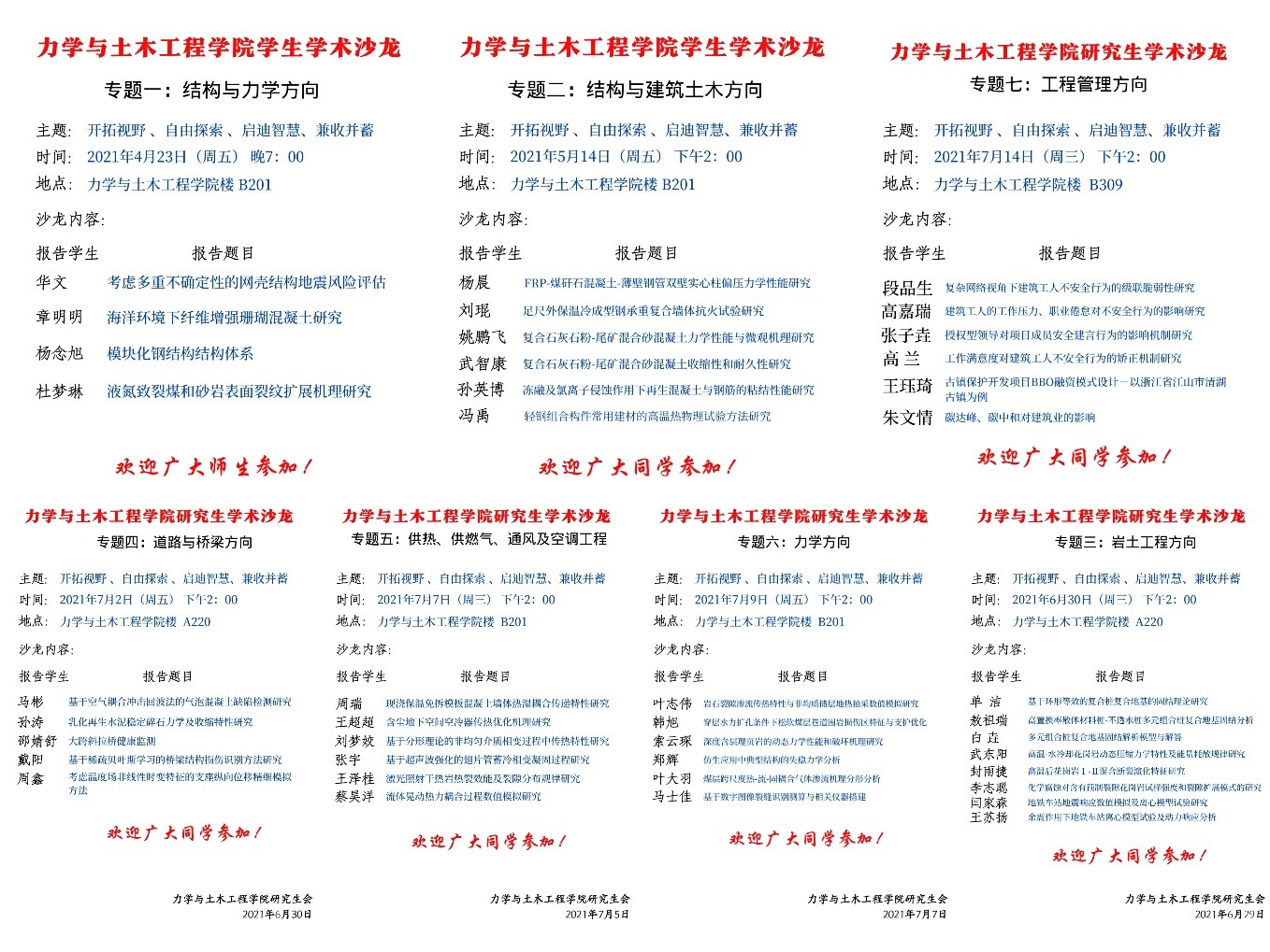 研究生会以本院研究生群体为活动对象,在2021年4月至7月积极开展了“聚焦力学土木,交流学科前沿”学术论坛系列讲座。
