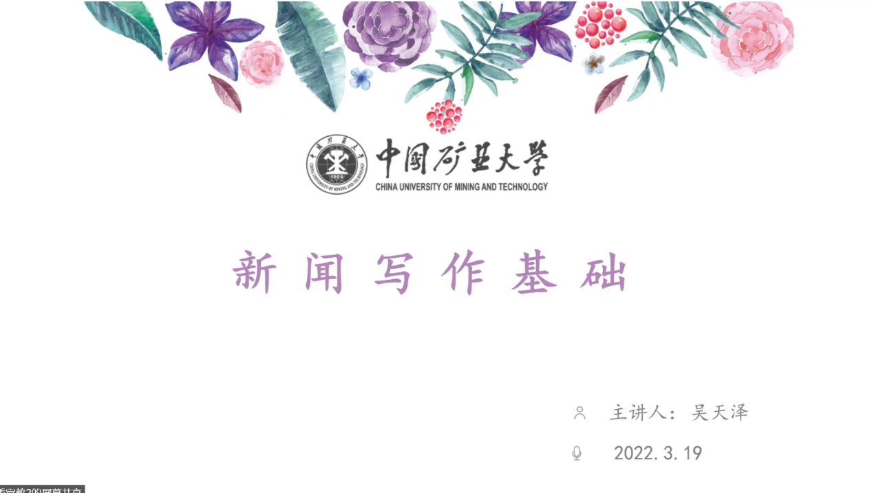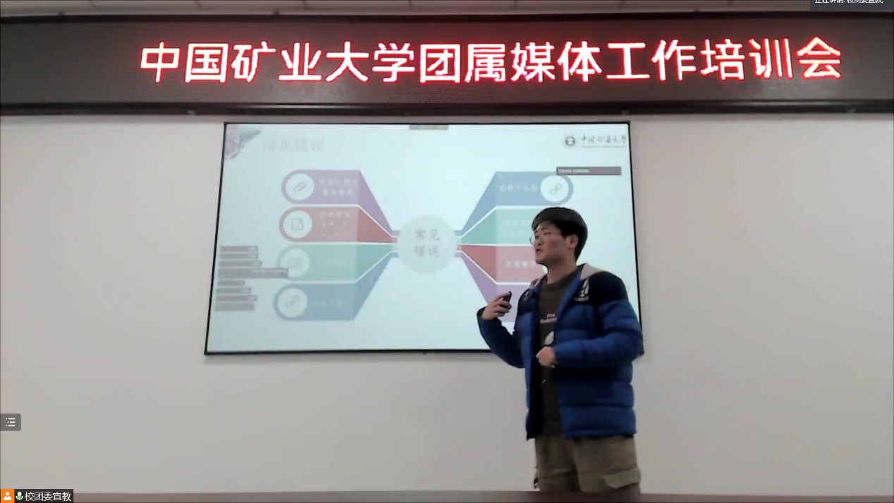 矿大青年融媒体中心新闻部主任吴天泽同学受邀作题为“新闻写作基础”的线上培训会。首先,吴天泽同学从什么是新闻、新闻怎么写、新闻稿撰写的常见错误及事例、如何写出好的新闻稿四个方面,结合自身经历为大家详细讲解了新闻写作的方法和技巧,让大家进一步明晰新闻的主要结构和文体特征。随后,吴天泽同学针对新闻具体类型逐一为大家进行讲解,强调了活动类、会议类等新闻主要类型的写作技巧和注意事项,并列举了以往新闻写作的典型错误,让大家在其中反省自己写作所发生的类似问题。最后,吴天泽同学说道:“新闻宣传无小事,三审三校要慎之又慎,作为媒体人,对待新闻一定要严谨、负责,能力决定下限,但态度决定上线,切记勤能补拙。”