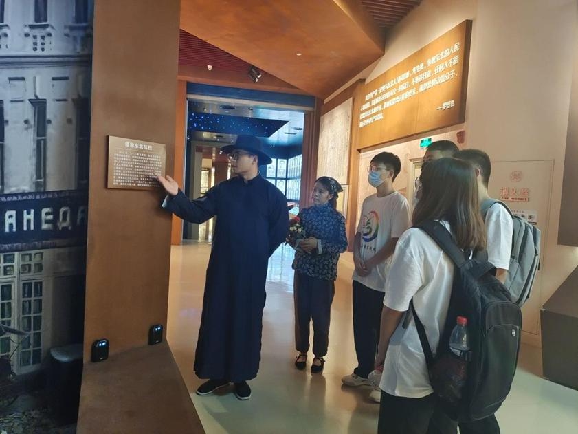 在参观过程中,实践团还遇到了身着民国服饰的工作人员,他们重现了罗登贤同志在了解九一八事变之后赴身报国的英勇事迹。在观看完演出后,实践团有幸邀请到了罗登贤的扮演者讲解那一段激昂而热血的历史。“……中国共产党人始终站在斗争前列,是反抗外敌入侵、维护民族独立的中流砥柱!”浑厚的嗓音缓缓讲述,带领实践团成员走进那个战火纷飞的时代。