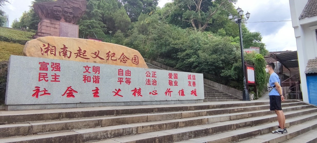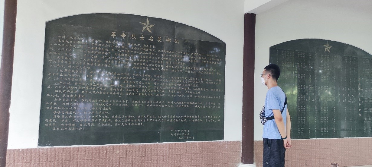 实践团成员首先参观了湘南起义纪念园,感受着当年先辈们舍身为国的凌云壮志和满腔热血。虽然纪念园最顶端的纪念塔正值修缮之际,但实践团成员们仍从其外观感受到了庄严肃穆的气息。沿着台阶向下,实践团成员参观了英雄牌,了解了许多郴州籍革命先辈的先进事迹。在那段艰苦的岁月里,革命先辈们忍受着艰苦的斗争环境,怀揣着救国救民的远大理想,为了国家和民族的未来抛头颅洒热血,他们是真正的民族英雄。最后,实践团成员参观了革命烈士名录碑记。这里详细记载着参加革命的每一位郴州籍同志的姓名和具体籍贯。实践团成员在此肃立良久,对在此留下姓名的每一位革命先烈表达了最崇高的敬意。