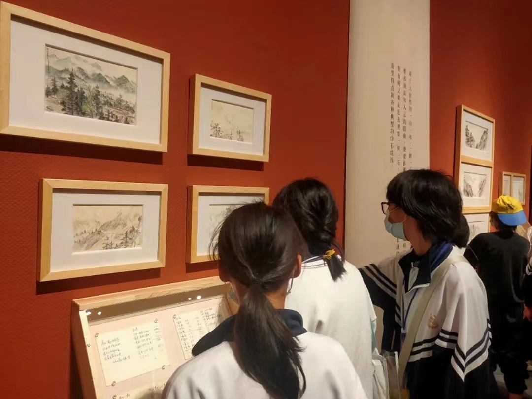 图为东华初级中学同学参观学习画作