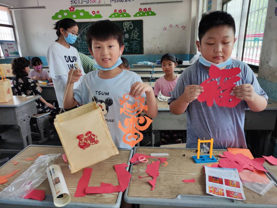 图为小朋友展示自己的非遗剪纸作品“福”和传统彩灯