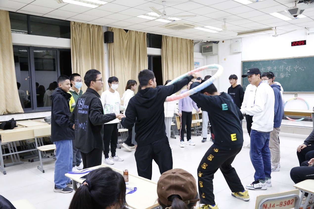 心理自助中心的带领下,大传全体成员于C104和C102两间教室开展集体团辅活动。团辅活动共分为“组团套呼啦圈”、“比反应”、“拼装轨道运输小球”三大环节。大传各部门激烈比拼,游戏的多样性和大家高涨的热情也让现场的气氛变得十分活跃。在一片欢声笑语中,干事们拉进了距离,见面会也圆满结束。