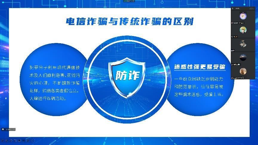 会议伊始,杨栋宇引入了本次会议的主题——“谨防电信诈骗,守护个人财产”。他从电信诈骗的基本简介、常见的电信诈骗类型、电信诈骗的特点以及防范和应对电信诈骗四个方面对电信诈骗进行了阐述,同时提醒同学们要做到“三不一要”,即不轻信、不透露、不转账、要报案,提高对电信诈骗的警惕。此外,杨栋宇针对院校新生提出了相应的防诈骗策略,呼吁大家在日常中认真学习防诈知识、增强防范意识、提高防诈能力,尽量杜绝诈骗案件的发生。最后,为了检验同学们对于防范电信诈骗知识的掌握,杨栋宇就会议所讲内容对几名同学进行了提问,取得了积极的反响。会议圆满结束。
