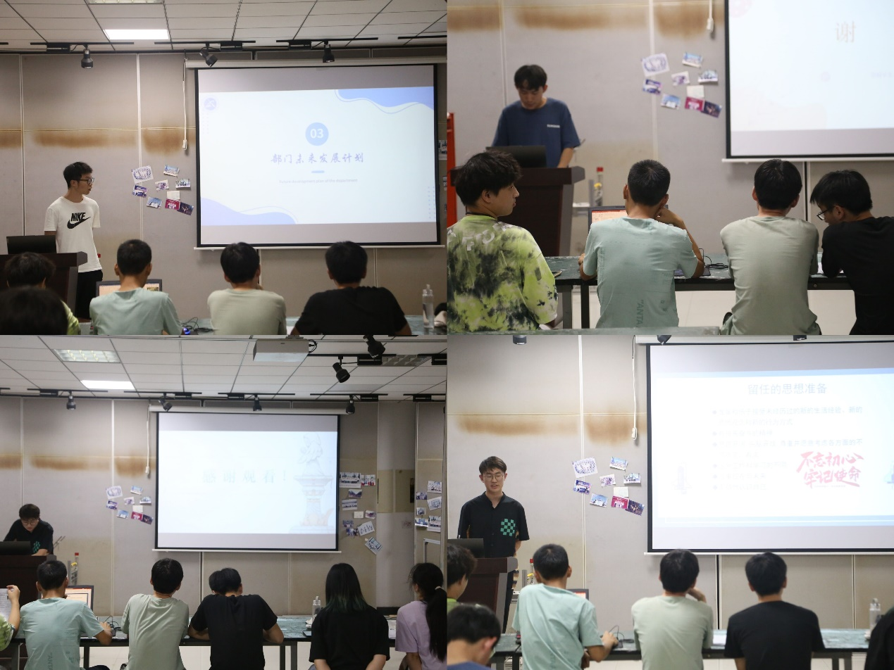 大学生科技创新协会主席李文磊简短地介绍了会议内容,并宣布换届答辩正式开始。在答辩环节上,每位参加竞选的同学依次上台进行自我介绍,展示工作内容,认真剖析自身优缺点,就个人工作情况、获奖情况等进行了简明的陈述,不仅总结了过去的工作,也对未来的发展提出了较为可行的规划。期间,现任主席团和部长团成员对参与答辩的同学进行了提问以及详细的指导,现场气氛轻松融洽。