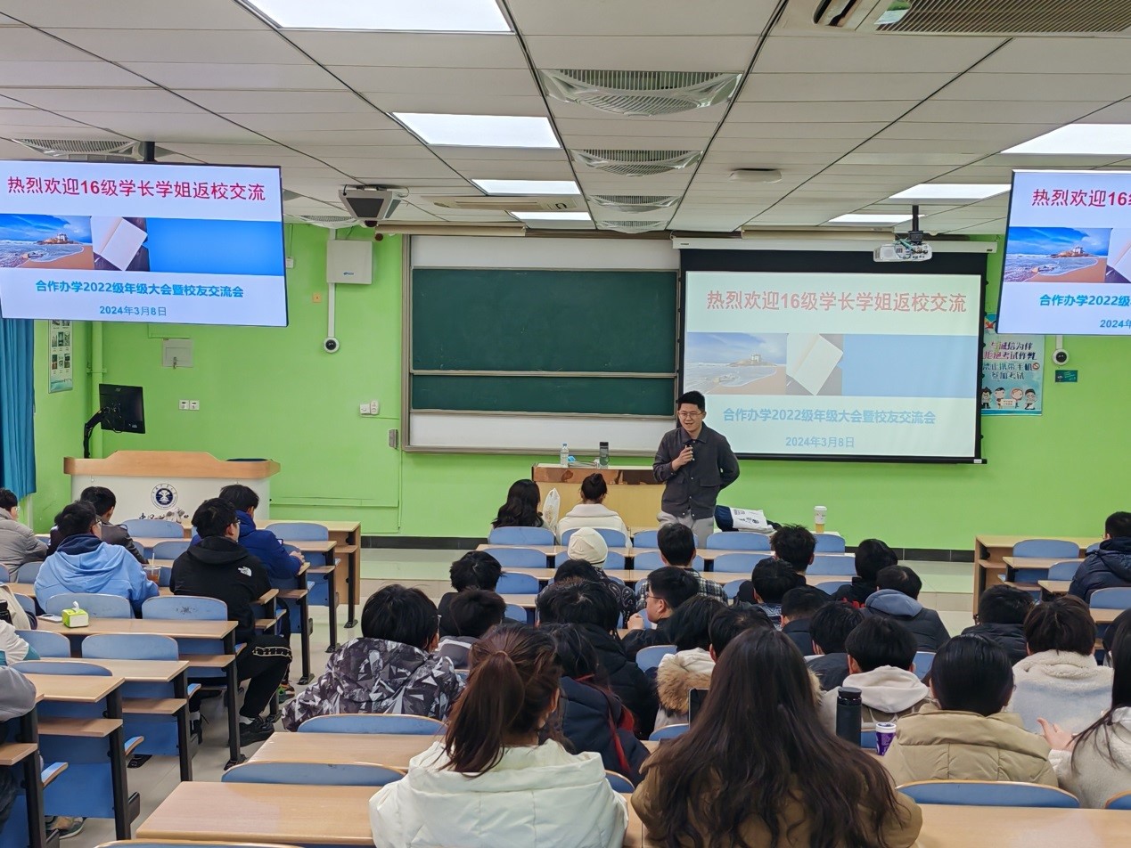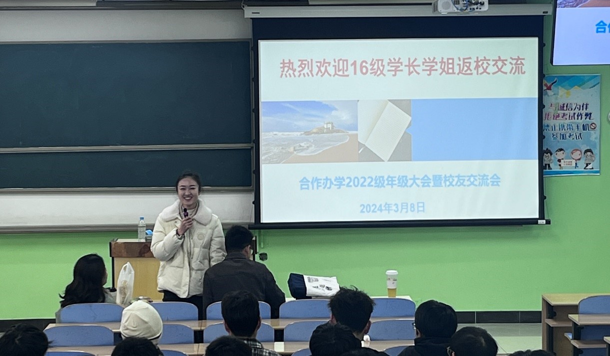 中外合作办学2022级专业全体学生于3月8日下午在博4A202举行年级大会暨校友返校交流会。2016级优秀校友王海铮、韩若愚、徐若恩应邀为2022级学子讲述自己的职业轨迹,并解答同学们对于选择发展道路的疑惑。本次活动由辅导员陈忠伟老师主持。