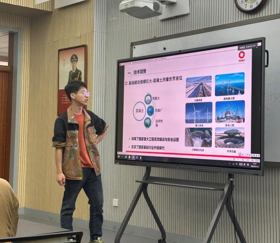 卢天乐分享了列车荷载作用下坡脚墙-褥垫层互锁基床结构变形数值模拟研究;杨昌龙介绍了铁基非晶合金纤维混凝土抗压强度与耐久性研究;张力带来了考虑预留轨道的公轨两用悬索桥施工过程研究;许海超分享了自己对新型双废注浆材料力学性能及微观结构研究的方案。费舒桓分享了基于数字孪生的张拉膜结构力学状态监测研究;韩启航从材料的设计背景和方法层面展示了混凝土低碳化稳定高效的制备;龙建均从灰度处理、阈值分割等方面介绍了基于红外热成像技术贴砖外墙缺陷检测及修复技术研究。