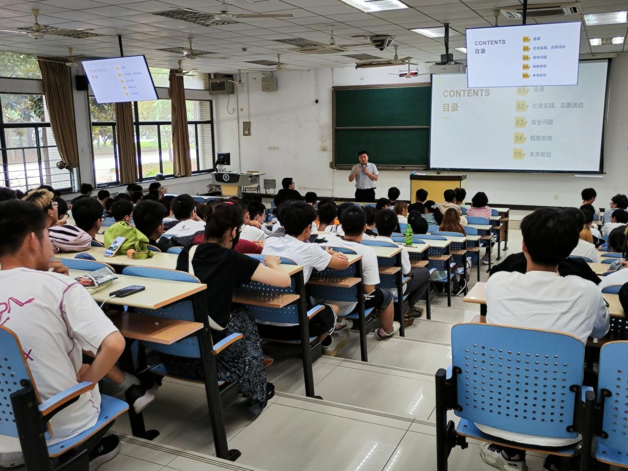 本次年级大会共分为选课政策、社会实践和志愿服务、安全问题、假期安排、未来规划等五个环节。首先,陈老师对选课要求进行了说明与讲解,他指出要严格对照学科培养方案,结合自身学习实际,合理选择选修课程,并仔细核对已选课程。然后,陈老师阐述了社会实践与志愿服务的意义,详细说明了社会实践与志愿服务的具体参与方式,并对第二课堂的社会实践、志愿服务等两门课程的认证标准进行说明。鼓励同学们积极参与社会实践和志愿服务,可以更好地了解社会发展的现状和需求,培养自己的社会责任感。