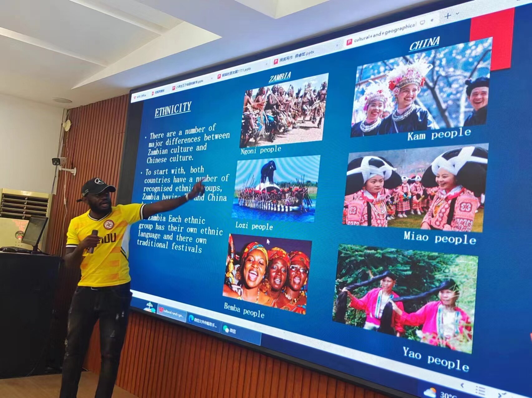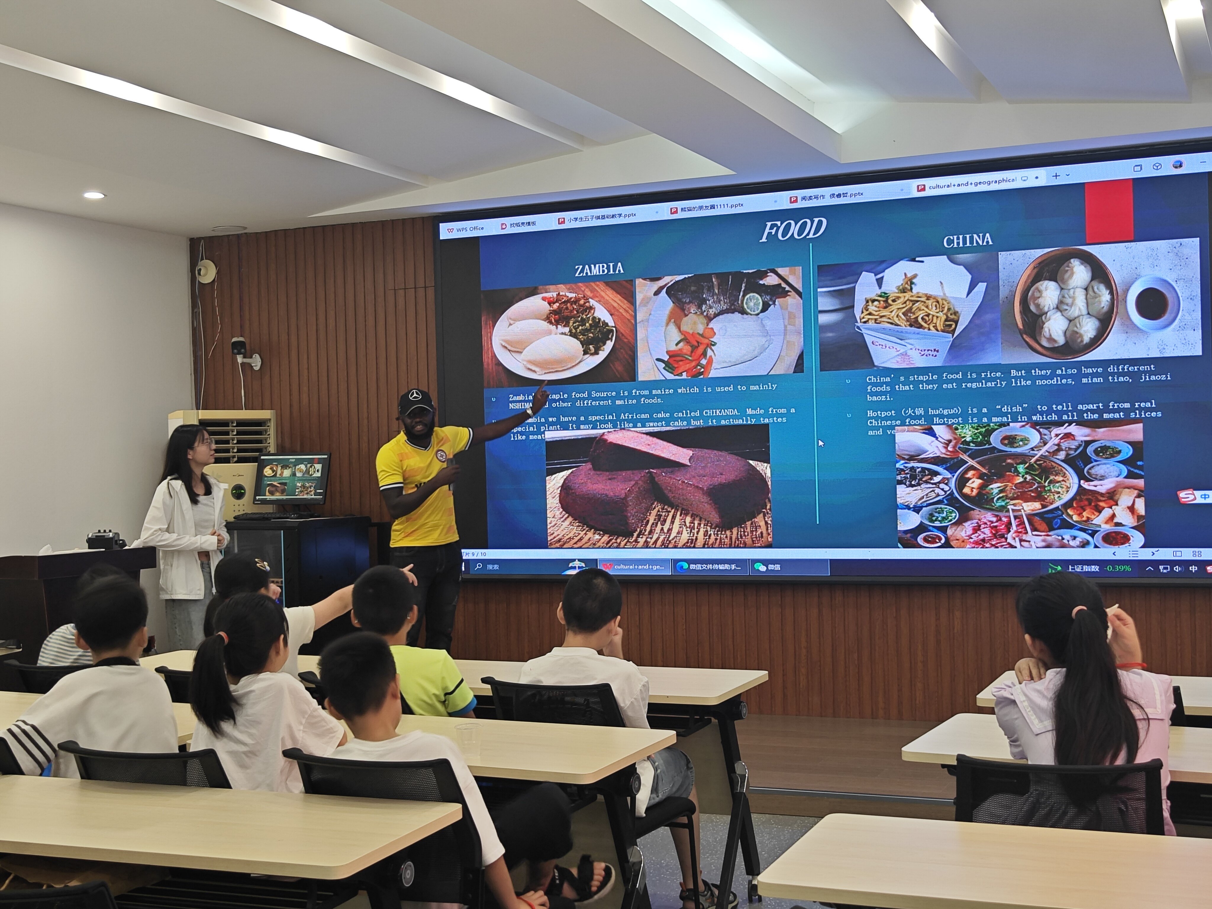 紧随其后的是奥古丝同学对于赞比亚文化与中国文化不同之处的讲授。即使语言不通使用英文授课,翻译同学也为其与孩子们搭建起一座爱的桥梁。奥古丝同学以询问孩子们是否知道撒哈拉沙漠为开场,从地理与人口的角度讲述中国与赞比亚的不同。除此之外,他还对中国与赞比亚气候进行对比,并对孩子们说赞比亚温度维持在十几至四十度之间,并不会出现下雪的情况,孩子们表现得很惊奇。深入研究赞比亚民族文化也是奥古丝的一个重点,他指出,同中国的56个民族一样,赞比亚亦有着不同的民族,这些民族相亲相爱,已然是一个共同体。最吸引孩子们的是他对赞比亚食物的介绍,孩子们提出各种天马行空的问题等待老师的回答,课堂在高涨的氛围中落下帷幕。