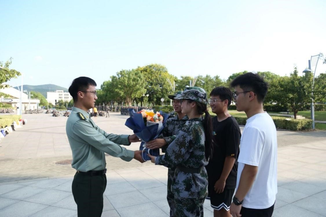 与此同时,正在进行军训的2024级新生们也没有忘记对培训辅导员老师们的感激之情。在训练的间隙,新生们自发组织了一个小型的庆祝活动,准备了鲜花,向参与训练的老师们表达敬意。老师们不惧酷暑在烈日下指导新生,新生们深知这份付出背后的辛苦与汗水。