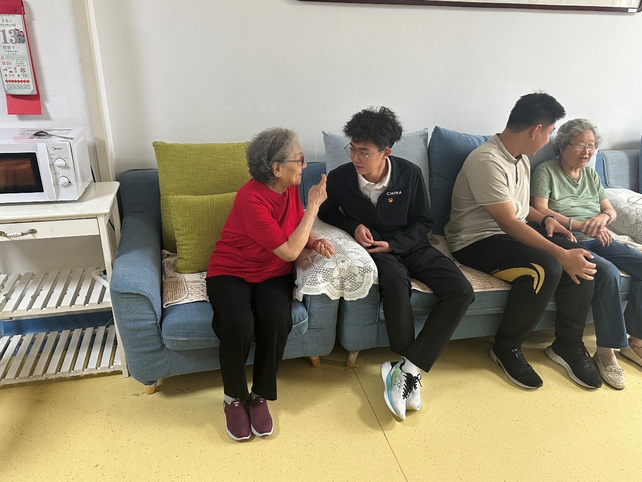 图为志愿者与老人交流沟通