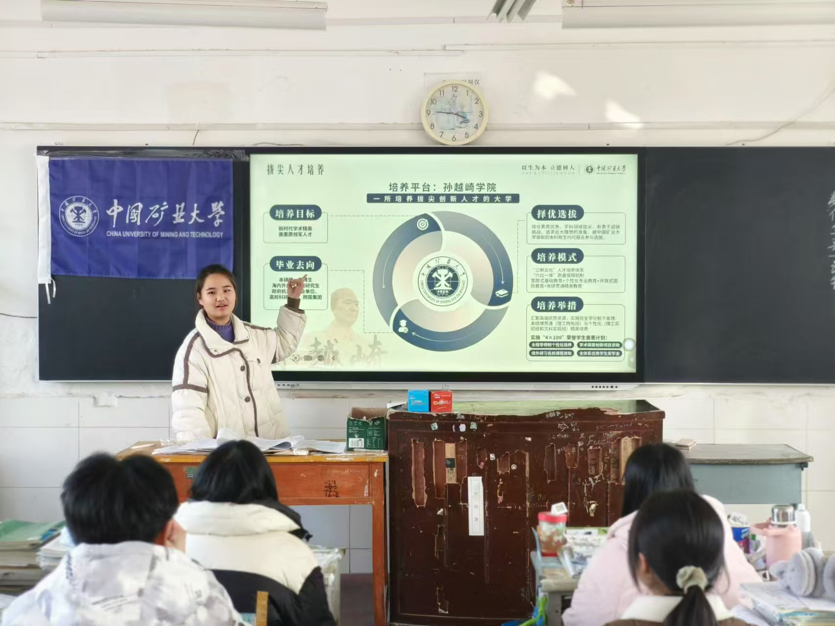 1月19日下午,实践团到达邓州市第一高级中学。团队成员们精心准备了内容丰富的宣讲会。总共由四个环节构成:第一个环节,矿大宣传:由宣讲人靳甲敏为以视频和PPT的形式为大家着重展示了矿大的校园风光,科研实力以及丰富多彩的校园生活,为学弟学妹们未来的志愿填报提供了有价值的参考。第二个环节,个人分享:由团队成员赵雯和靳甲敏分别分享他们的学习经验,为正处于复习阶段的高三生带去了宝贵的经验和努力方向,同时, 她们分别分享了自己与矿大的真实成长故事,以此鼓励告诉高三学子树立远大理想,勇敢追逐梦想。这些真实而生动的经历,让同学们对大学生活充满向往,现场气氛热烈非凡。第三个环节,互动答疑:同学们踊跃提问,从专业选择,学习方法到大学生活方方面面,都表现出强烈的好奇心,团队成员耐心解答。第四个环节,合影留念:“青春百花洲”团队同高三学子一同合影留念。同时该团队建立矿大&一高QQ交流群,为一高学子提供更多的交流机会。