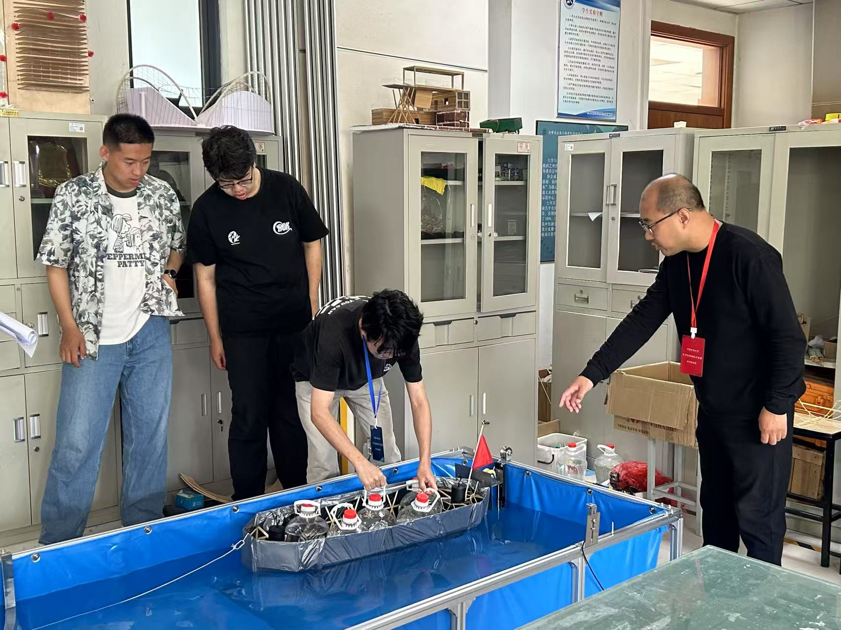 本届大赛以绍兴水乡标志性文化符号“乌篷船”为主题,要求参赛团队在优化船体流线型、提升抗撞击性能的同时,兼顾载重与航行能力的平衡。在加载现场,各参赛团队通过现场答辩阐释设计理念,形成理论与实践的双向互动,充分展现我校学子的创新思维与工程实践能力。参赛作品通过设计防撞构件、船体龙骨框架等创新方案,展现出对材料力学性能的精准把控。评审组特别关注模型在三级波浪荷载下的位移响应与结构完整性,范力老师观看了每支团队的加载表现,对参赛队员模型的设计构思进行倾听和指导,并鼓励同学们拓宽思维边界,在模型构建实践中充分释放创新潜能。