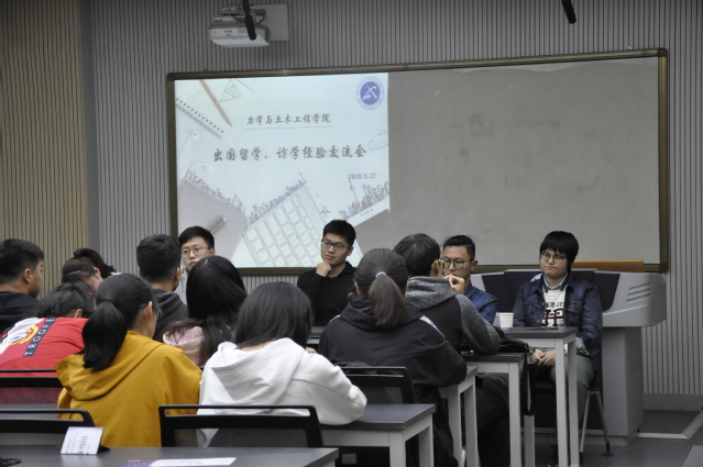 会议伊始,莫品强老师分享了自己的留学经验,结合曾在英国诺丁汉大学的求学经历和学生提出的问题向同学们详细讲解了选校定位、推荐信、语言考试、学校申请等一系列问题。莫老师在演讲中说到,出国留学有助于个人的全面发展,希望每个人都可以去开拓全新的视野,体验与在国内不一样的学习生活。随后,李玉琦、夏海天、马敏妤、叶政杰四位同学先后进行了经验分享。他们针对土木工程各个专业在国外的近况进行了详细地解读,综合世界权威数据,从他们各自不同的角度出发表达了许多实用性的看法,为同学们申请国外大学提供了参考。至此,交流会圆满结束。