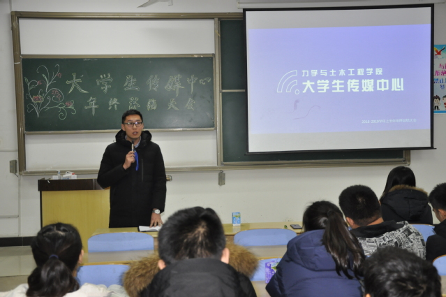 新闻宣传工作做了总结;副主任张昕则对宣传工作提出了一些不足之处及改进的措施。三位主任从工作中取得的成绩、存在的问题、工作计划及目标三个方面进行了客观的阐述,以认真、诚恳的态度分析、评价了工作,同时对大学生传媒中心新的一年的工作进行了清晰的布局。为了让部门成员对2018年大学生传媒中心的工作情况更加了解,记者站、新媒体工作部、综合部及广电台四个部门负责人相继上台进行工作总结。各个负责人以PPT的形式对本部门一年的工作情况做出概述,总结了工作上的得失。会议最后,李亮老师做了全面的总结,对于大家本学期取得的成就给予了充分的肯定,同时他也对大家未来的工作提出了希冀,希望大家能够不忘加入学生组织的初心,以更充分饱满的热情面对未来的工作。