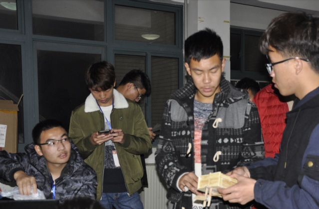 在经历了近十天的制作后,签船比赛各参赛组都做出了自己的模型,并准备至桃三A518提交作品并称重。各参赛队伍在到达桃三A518后,仍不断地检查着自己的模型,并及时进行修复。在提交模型后,有些同学并未离开现场,而是饶有兴趣地看着别的队伍的模型,并在讨论着后天的比赛谁的作品将会夺得头筹。