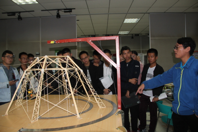 楼进行学习参观。首先展示的是大跨度网壳模型,该模型结构的所有杆件、节点、连接部件均采用比赛所给定竹材及胶水制作完成。制作该模型要求同学们针对静载、随机选位荷载及移动荷载等多种荷载工况下的空间结构进行受力分析、模型制作及试验。过程中创协的成员们还现场展示了该模型的受压能力并向感兴趣的同学传授了模型制作的经验和心得。