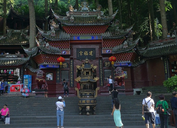 青城山是中国著名的道教名山,中国道教的发源地之一,自东汉以来历经二千多年。公元143年,道教创始人“天师”张陵来到青城山,选中青城山的深幽涵碧,结茅传道。实践团成员参观内容以青城山前山的道教宫观为重点,如建福宫、上清宫、祖师殿、圆明宫、玉清宫等。踏上青色石阶,展现在眼前的参天绿树,古朴庙宇,袅袅升起的青烟,以及庙中端坐的神像,能使人领悟到道教“天人合一”的理念。道观依山而建,错落有致,以三为建筑构思,体现了道家道生一、一生二、二生三,三生万物的宇宙乾坤观念。建筑上布满的绘画和浮雕装饰,表达了道家清静无为、健康长寿的思想。在参观过程中,实践团成员注意到一个随处可见的标志,该标志以“幽”字为主形态,结合了三柱香(道教)和山字,表达了道教名山的涵义和“青城天下幽”的宣传口号。