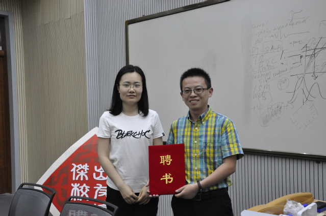 骆奕老师热烈欢迎两位校友在矿大建校109年校庆之际回到母校参加本次座谈会,并为校友颁发“中国矿业大学大学生创新创业导师”聘书及“杰出校友讲坛”纪念杯。