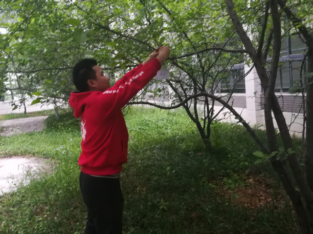 树铭牌,是指悬挂或插植在树木旁边的介绍牌,是对树木的中英文名称、学名、科目、属种、习性、产地、生长分布等相关科普知识的介绍,有利于同学们在观赏树木的同时也能对树木的特性有相应了解。下午2点,志愿者们在公教区集合,一起讨论公教区的树木种类及其信息,然后用纸片、细绳、塑料封套等制作铭牌,并将事先查找好的树木信息写在铭牌上。在制作过程中,志愿者们不断地交换意见,力争将铭牌制作的更加精致。3点左右,志愿者们带上制作好的铭牌,在公教区一棵一棵地辨别树木的种类,为树木戴上铭牌。同时志愿者们也在公教区搜寻着没有无未发现的树木种类,并用照片拍摄记录下来。下午四点,此次活动顺利完成。