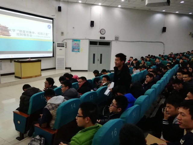 晚上七点,报告会正式开始。会议伊始,星级宿舍代表何陈、明星班集体代表黄璐、学习优秀之星刘雨婷、学术科研之星郑世帅、自强不息之星张亚军以及社会活动之星马学宝先后上台进行展示,分享他们在班级建设、学习、社会实践、宿舍建设以及学生工作等方面取得的成绩和经验心得。展示之后,现场同学就自己大学生活中遇到的问题积极提问。其中一位同学就如何建立自己的合作团队提出了疑问,报告团的同学就提高个人能力,多参加活动,建立和扩大自己人脉等方面提出建议。还有同学询问如何更好地去进行班级工作建设,报告团的同学以自己的班级为实例,提出了设身处地为班级同学着想等方面做了相应的解答和建议,报告团的精彩解答和诚挚建议赢得了大家的喝彩。最后,巡回报告会在现场同学热烈的掌声中落下帷幕。