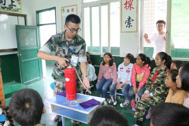 筑梦公益暑期支教团一分队对学生进行国防教育活动。一分队黄霍明老师对学生进行军人队列动作、消防知识、防震减灾方面知识的培训。