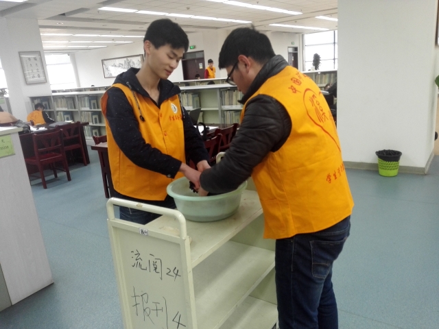 下午四点整,建档生们准时的在图书馆大厅里集合并穿戴好工作服,图书馆老师对他们进行了简单的培训。吩咐完任务后,负责人先对建档生们进行分组并且挨个分发抹布、手套等工具,建档生们便迅速投入到工作当中。大家纷纷卷起衣袖掏洗抹布,轻轻地擦拭书柜,整理着书籍。同学们将书架上的书按照书号排列整齐,将放错的书籍归于原位,方便了大家借阅。他们工作十分认真,一丝不苟,辛勤的工作也获得了老师与学生们的肯定。
