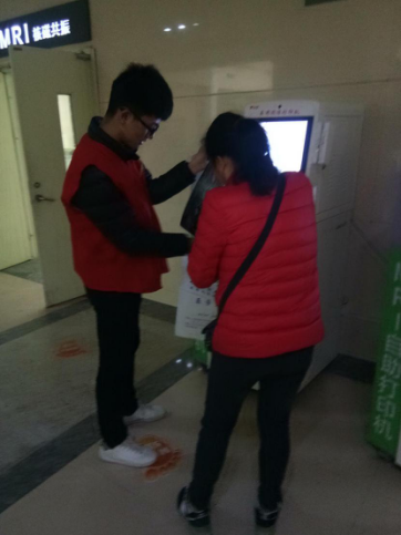下午一点半,志愿者们在学校北门集合,在活动负责人杨良泽的带领下到达徐州市第四人民医院。在医院相关工作人员的细心讲解下,志愿者们很快就学会了医用仪器的使用方法。随后,志愿者被安排到不同地点进行工作。一部分志愿者在门诊楼的服务大厅,负责引导前来就诊的患者使用自助挂号机,由于一些病人及其家属没有使用过这些设备,志愿者们不厌其烦地解答着一个又一个病人的疑问。当遇到一些难以回答的问题时,志愿者会在第一时间去询问医护人员,使每名患者都可以高效地完成就诊。还有一部分志愿者负责帮助患者打印病情报告及化验单。有时会遇到一些比较着急的病人,志愿者就耐心地安慰他们,尽量稳住病人的情绪。在这三个小时的活动过程中,志愿者一直认认真真地服务着。下午五点,活动顺利结束。