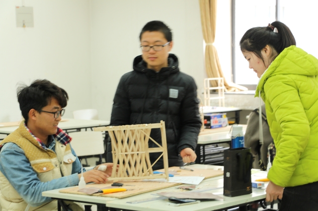 楼前进行了结构加载并进行了角逐。兴趣组则是希望吸引广大非力学专业的同学参与建筑模型制作,提升大家对结构的认识和对动手能力的培养。兴趣组的制作时间为3月17日晚7点到3月18日晚上10点, 3月19日上午在二食堂广场了进行加载。第一轮进行静加载,小组派出一个人在模型上站立15秒,如若模型不受损坏,第一轮即为成功。第二轮则选择同一个人将模型固定在脚上,走过一个总长10米的U型跑道,通过时间长短计算出最后的成绩。