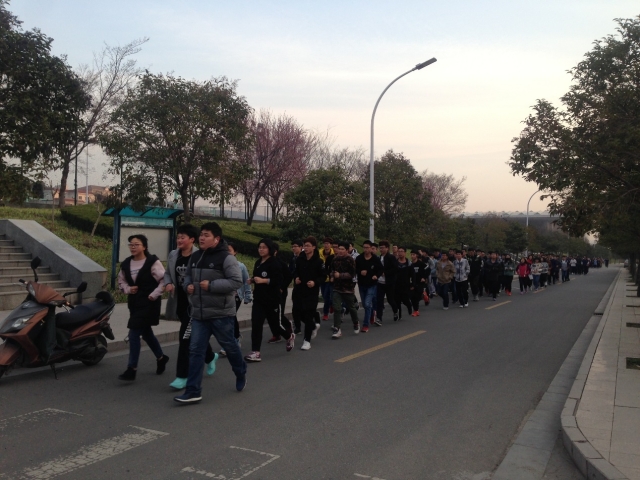 2016级辅导员曹鹏老师组织本年级全体学生环绕桃苑运动场进行早操晨跑。