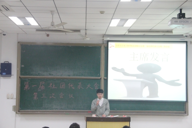 社团联合会于博一A101召开第一届社联代表大会第三次会议。社联主席、副主席、四个部门部长及其部员,以及19个社团会长参加此次会议。此次会议由办公室主任武天浩主持。