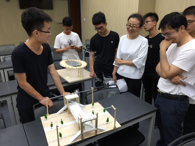比赛当天,天公虽不作美,但参赛者热情未减,一审共进行两个环节,上午参赛者将本组所做结构模型送至评比现场,下午由指导老师正式开始模型点评。其中点评环节首先要求模型制作者进行模型展示,然后与指导老师进行设计沟通,最后由老师给出指导意见。本次结构设计本着“创新、合理力学知识体现”原则,给参赛者提出了一定的难度,参加比赛的大多为大一新生,大多数参与者更是初次接触结构设计,但部分作品也不乏新奇的想法与先进技术的应用,其中就包括了3D打印技术。另外,参赛的作品虽然在力学知识上的考虑有所欠缺,但参赛作品形式还算丰富,其中就涵盖了未来空中花园、未来地铁站,此外也不乏超大跨度、外形美观的悬索大桥与符合当下以及未来生活的生态城市。