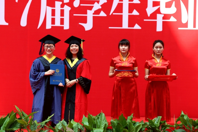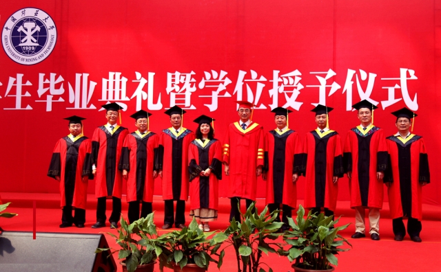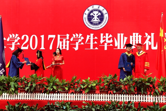 和深部岩土力学与地下工程国家重点实验室2017届毕业研究生(10名博士、147名硕士)身着学位服依次登上主席台,校长葛世荣和院长叶继红为他们一一扶正流苏、颁发学位证书。此刻,收获时的幸福笑容洋溢在每一个人的脸上,大家纷纷以毕业典礼现场为背景拍照,留下这美妙的时刻。