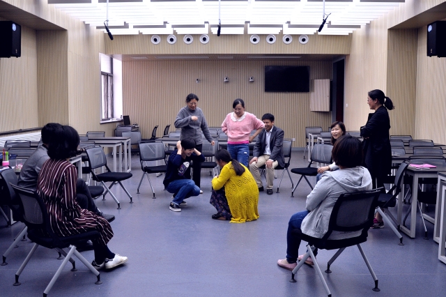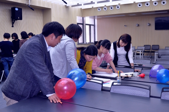 下午两点,活动正式开始。活动流程分为热身运动、压力圈和解压之道三部分。在灵活可爱的手指操运动后,李老师指挥大家按照工龄的长短,通过非语言的交流进行排队。接着,在紧张刺激的猜拳中,大家开始了由鸡蛋变成小鸡,再到人,最终到神的“成长三部曲”游戏。只见老师们个个小心翼翼,场上不时传出老师们退化降级的懊恼声和晋级成功的欢呼声。到了“情绪猜猜猜”游戏时,气氛更是热烈。每位老师偷偷写下和压力相关的一个形容词,通过所吹气球的大小代表目前的压力状态,接着用非语言的形式演绎这个形容词,并让其余人竞猜,猜中的老师便可成为表演老师的最默契搭档。
