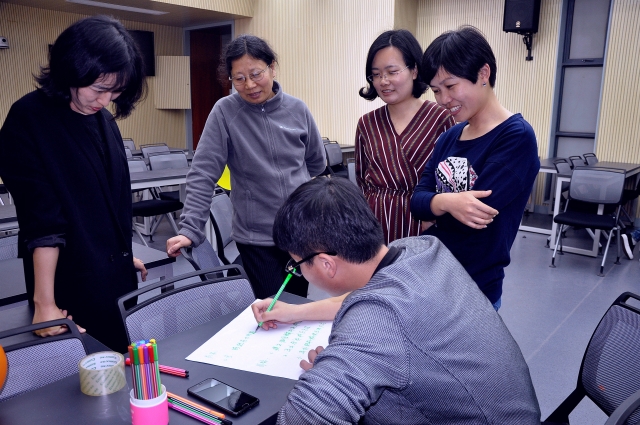 欢快愉悦的热身活动使大家慢慢进入到了放松状态,随之而来的是压力圈环节。李老师将活动成员分为两组。每组有属于自己的组名、口号和目标。接着小组成员认真写下自己目前的压力清单,并经过集中讨论确定出小组的压力清单。老师们纷纷就压力事件表达自己的身心感受和应对措施,讨论气氛热烈。针对大家的压力清单,李老师分享了减压26式供大家参考。随后,她还带领大家通过做动物操的形式进行现场减压体验。最后,活动以每位成员讲述活动过程中最开心的事和以一个词形容本次活动的感受告终。