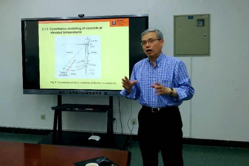 A220室举办了两次学术报告,报告题目分别为“An extended finite element model for modelling localised fracture of reinforced concrete beams in fire”和“A robust static-dynamic procedure for modelling the progressive collapse of steel structures in fire”。两次报告主要介绍了扩展有限元计算模型、混凝土裂缝单元模型、结构倒塌计算方法和高温粘结滑移模型等,并将上述模型应用于火灾下混凝土梁变形行为和裂缝模拟及结构倒塌机理分析。在座师生与黄教授就各种构件火灾行为、扩展有限元和裂缝数值模拟问题进行深入热烈的交流与讨论。报告会由袁广林教授主持。