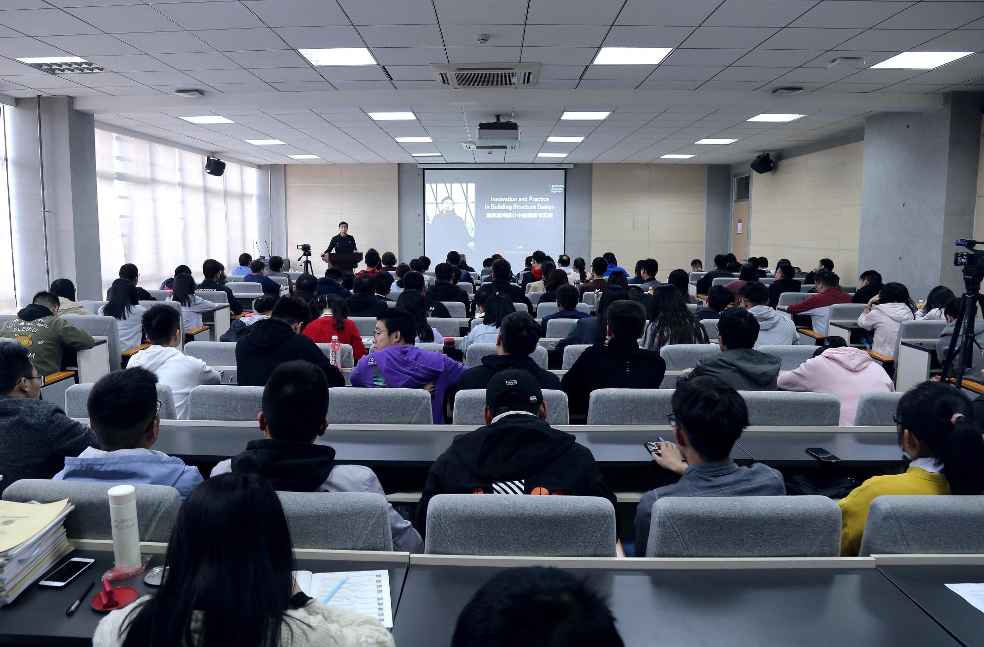 丁洁民教授从风工程找形中的建筑结构设计、巨型结构体系选型与研究、电涡流TMD技术的研究与应用、外幕墙结构设计与建造、数字化设计与建造等五个方面详细介绍了上海中心大厦的结构设计特点。丁教授结合50多个具体的案例,阐述了如何实现建筑造型与结构体系相结合、建筑空间与结构布置相协调、建筑质感与结构材料相融合,给与会师生传递出“找出最合适的结构,而非最佳结构”、“结构要把材料用足,不一定用最好的材料,但要用最合适的材料”等结构设计和施工理念。最后,丁教授简要介绍了消能减震技术、隔震技术、数字化技术等结构新技术。