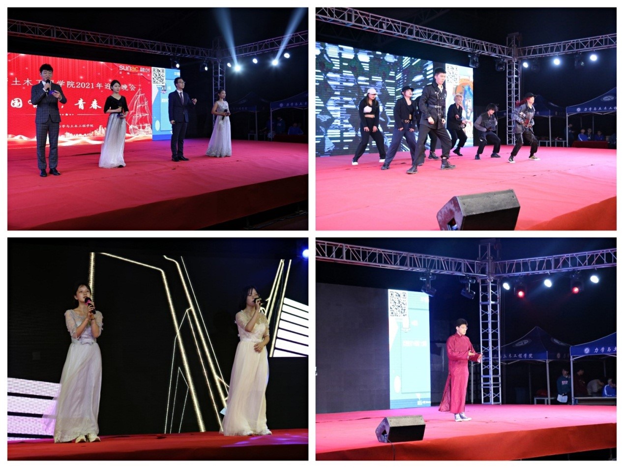 晚会以“一秋缘共‘杜’,四载济‘砼’舟”为主题,共分为“微光喜相遇 璨若星河”、“青春难诉说 醉于花火”、“鹏鸟待扶摇 凌绝云霄”三个篇章。晚会节目编演形式多样,包括相声、歌曲、京剧、舞蹈、小品、萨克斯独奏、洞箫等,尽显2021级新生的活力与朝气,展现了力学与土木人开放包容、求是创新的精神风貌。迎新晚会也在线上同步直播,人气火爆。