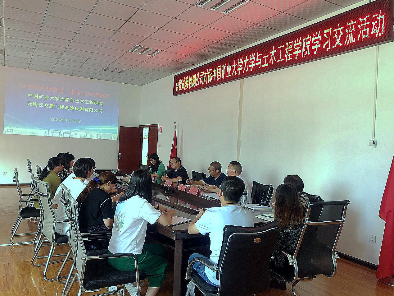在学科建设、师资队伍、研究生培养等方面的特色。云南云交建工程试验检测有限公司冯义虎教授级高工对杨圣奇副院长表示了欢迎,介绍了云南云交建工程试验检测有限公司的发展历程和企业现状。云南云交建工程试验检测有限公司总经理谭昆华指出中国矿业大学历史悠久,底蕴浓厚,人才辈出,希望未来在学生实习实践、就业育人、科研合作、人才培养等方面进一步加强交流和合作。